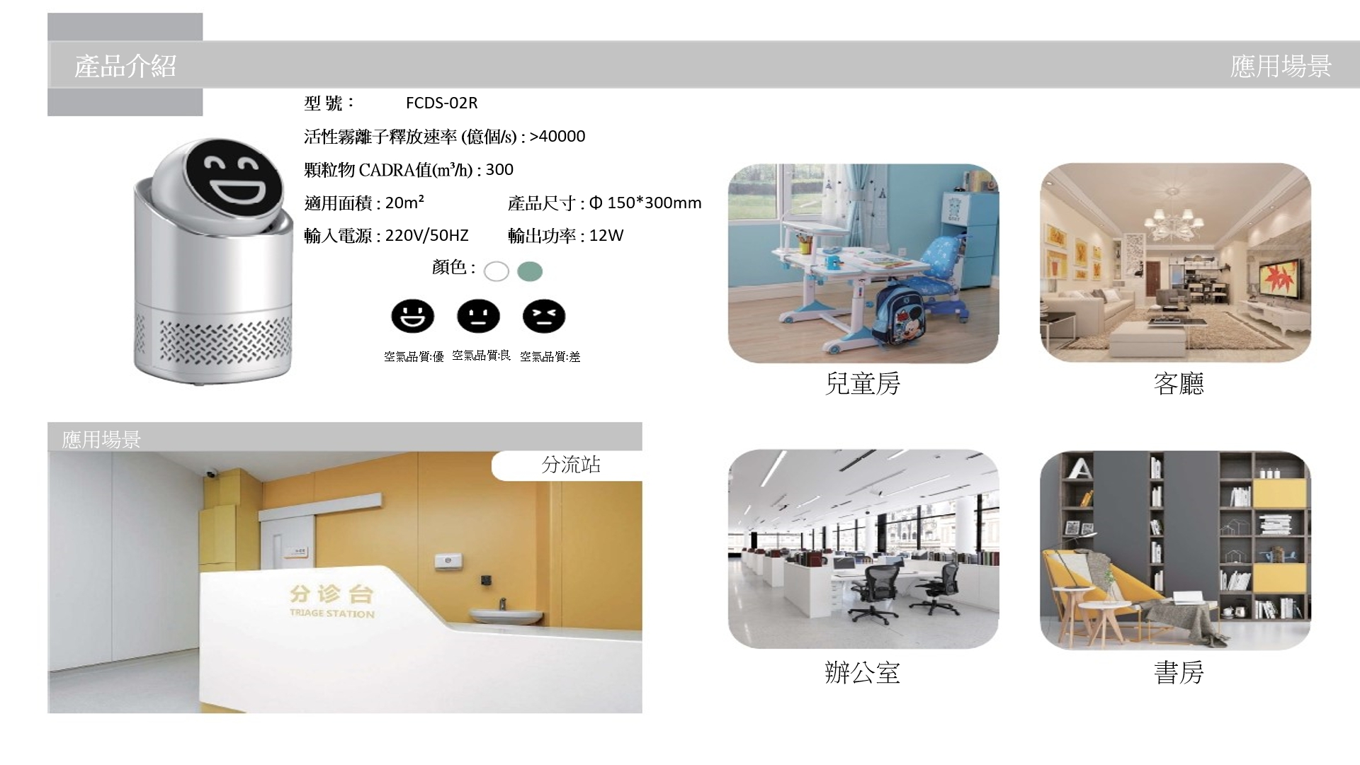 產品用途:適用於門診室、辦公室、檢查室、治療室、感染性疾病診室等場所的空氣消毒。